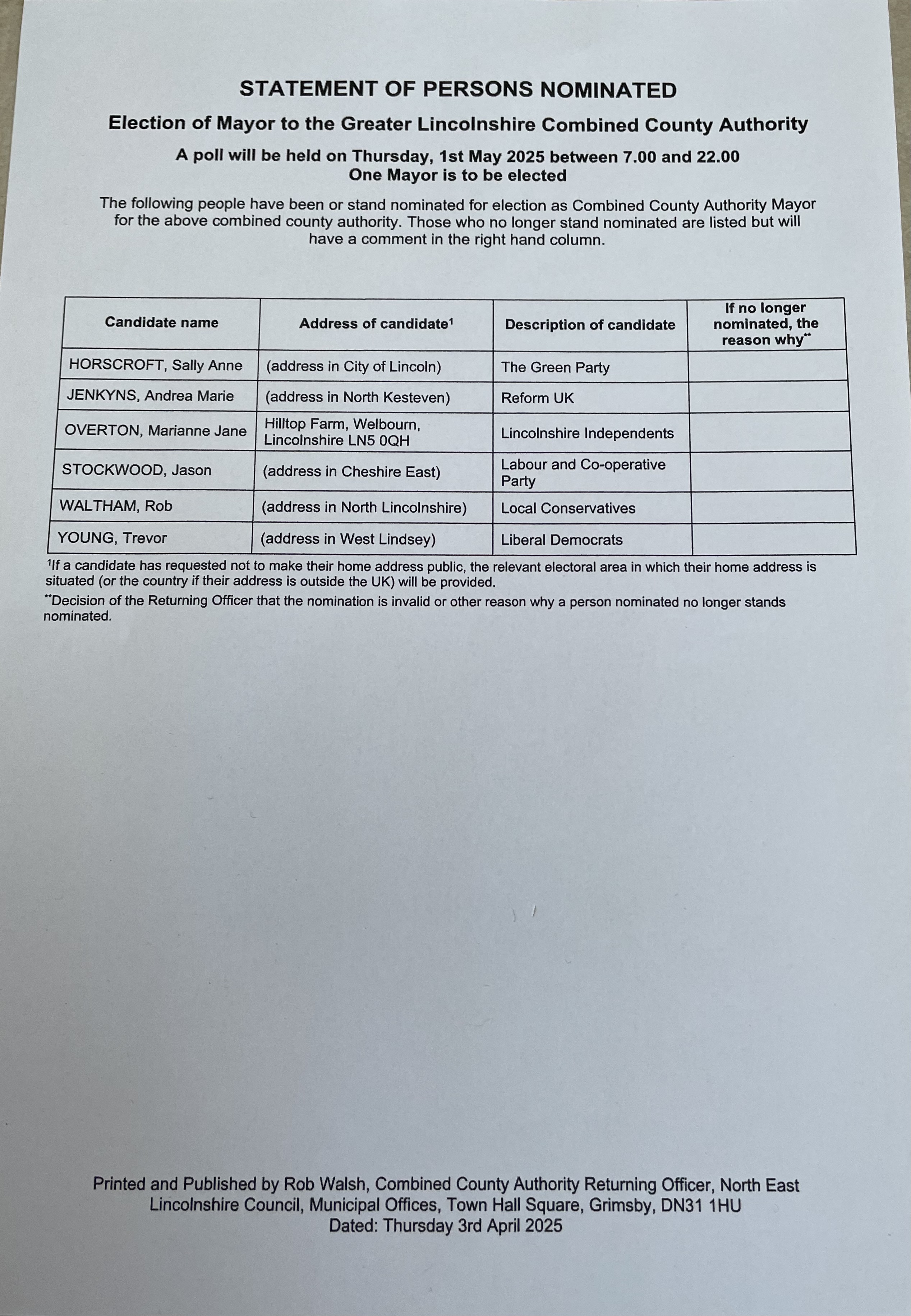 Nominations for Greater Lincolnshire Mayor