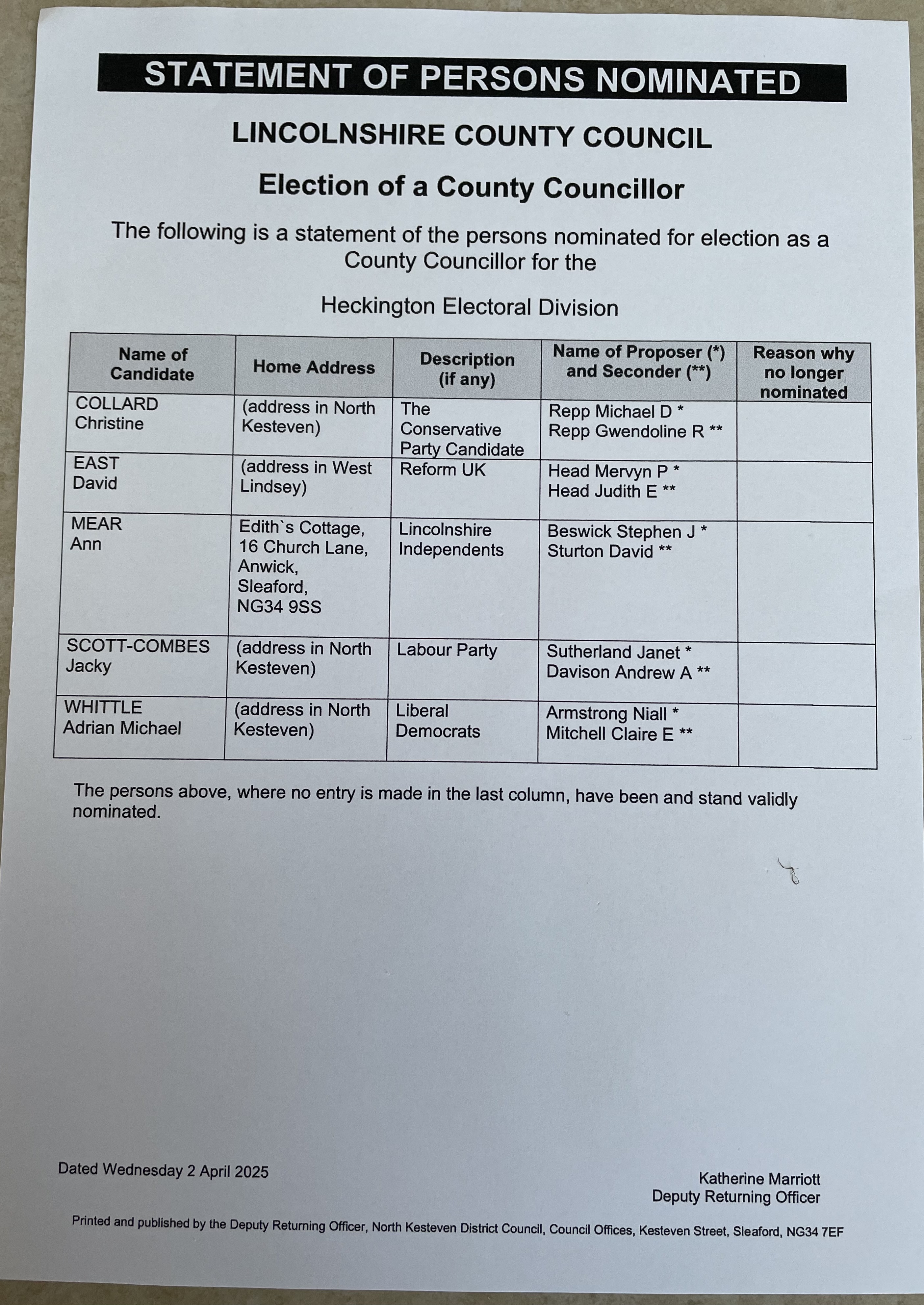Nominations for County Councillor in the Heckington Electoral Division